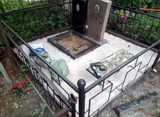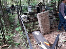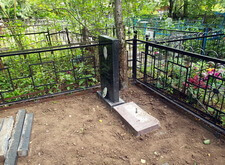 Первым делом мы принялись за демонтаж: сняли памятники с основания и поправили постаменты, надёжно укрепив их в земле. Таким образом мы избежали дальнейшего перекоса памятников и поставили оба надгробья на один уровень.