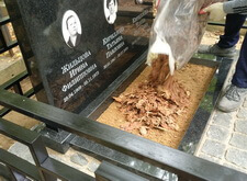 Снимаем с памятника защитные наклейки, красим ограждение, наполняем цветник корой.