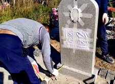 Замываем брусчатку и снимаем с надгробья защищающий надпись и фотокерамику скотч, протираем памятник от строительной пыли.