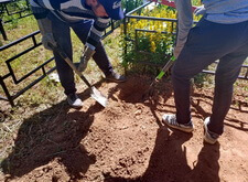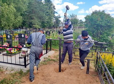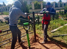 На каждом из четырёх углов вкручиваем сваи. Грунт на данной могиле попался твёрдый, после того, как сваи уже не вкручиваются, начинаем их забивать. Окончательно загнать сваи в землю так и не удалось, поэтому срезаем выступающие части. На качестве каркаса данное решение никак не отобразилось, так как длинна наших свай всегда несколько больше, чем требуется.