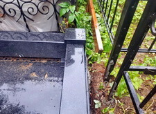 Привозим заранее изготовленное гранитное ограждение, согласованное с клиентом. На этапе монтажа цоколя зачищаем от полировки все соприкасающиеся поверхности и делаем на них засечки: это поможет клею лучше схватиться, тем самым продлевая срок службы ограждения. Балки мы приподнимаем за счёт специальных проставок. Такое решение очень удобно: в пятисантиметровые щели будет уходить скапливающийся на могиле мелкий мусор, во время дождя туда будет стекать вся влага, а при выполнении влажной уборки достаточно будет просто пролить территорию места захоронения необходимым количеством воды.