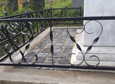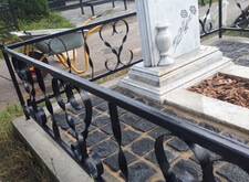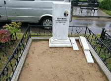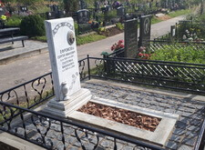 Внутрь бетонного цоколя кладём брусчатку, красим оградку, наполняем цветник корой, надписи на памятнике покрываем чёрным акрилом. Обычно мы кладём наземное покрытие так, чтобы бетонного цоколя не было видно, однако, в данном случае клиент не пожелал переустанавливать ограждение и проводить какие-либо дополнительные работы, так что брусчатка была уложена вовнутрь. Состояние места захоронения после проведения работ представлено на нижеприведённых фото.