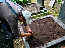 Закончив с первой могилой, мы приступили ко второму месту захоронения: засыпали новой землёй заранее прополотый цветник.